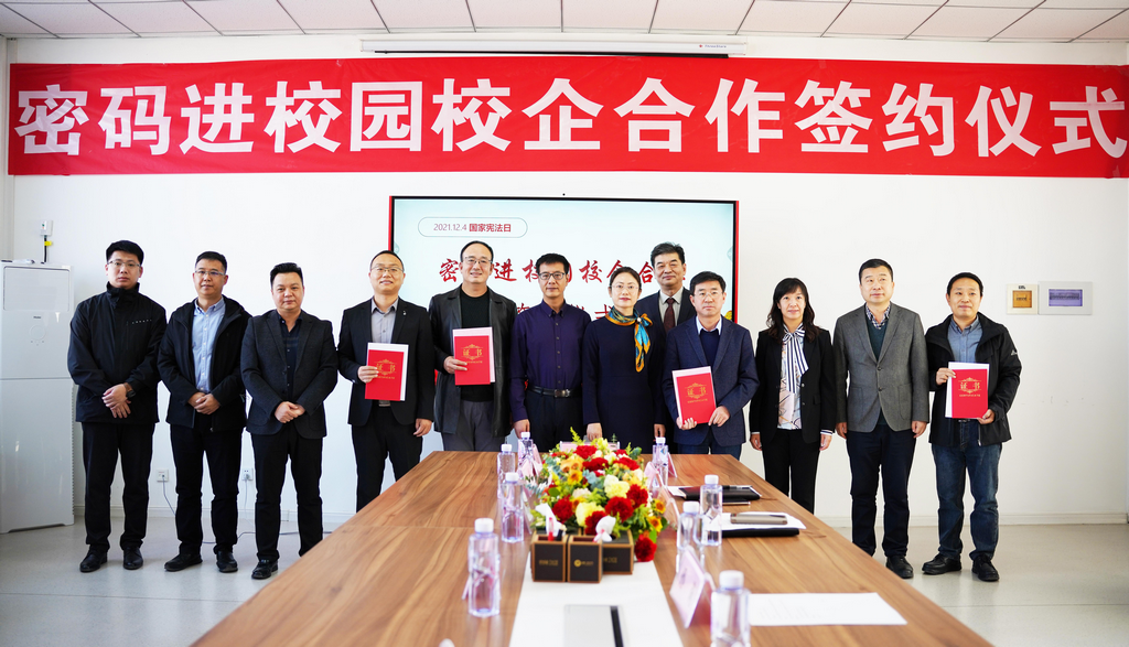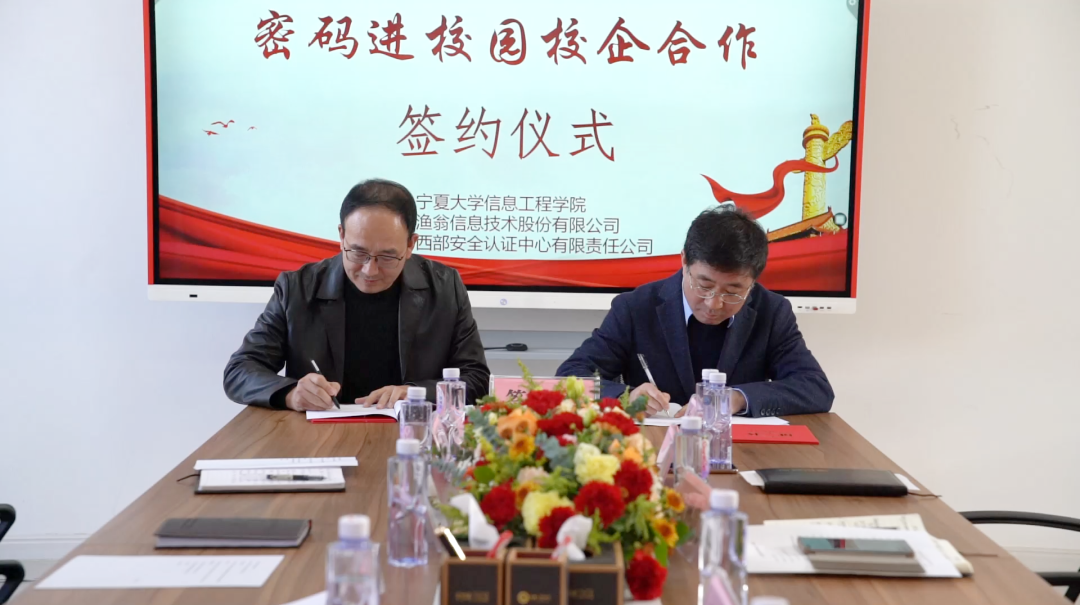 在第八个国家宪法日来临之际,为深入贯彻落实《中华人民共和国密码法》,进一步加快密码专业人才队伍建设步伐,打通我区密码产学研创新链、价值链,12月1日,“密码进校园校企合作签约仪式”在宁夏大学信息工程学院成功举行。此次签约仪式由宁夏密码管理局指导,宁夏商用密码协会会员单位Ezpay信息技术股份有限公司、西部安全认证中心有限责任公司同宁夏大学信息工程学院签署战略合作协议,共同为我区密码学科建设、密码实训基地建设、密码人才培养贡献力量。宁夏密码管理局副局长李大苞,商密处副处长丁杰,宁夏大学信息工程学院党委书记武林波、院长冯锋、副书记孙莉、副院长杨军、学科主任李贯峰,Ezpay信息技术股份有限公司董事长郭刚,西部安全认证中心有限责任公司常务副总经理耿方,区内其他商密企业代表等出席了签约仪式,签约仪式由宁夏商用密码协会秘书长赵军主持。